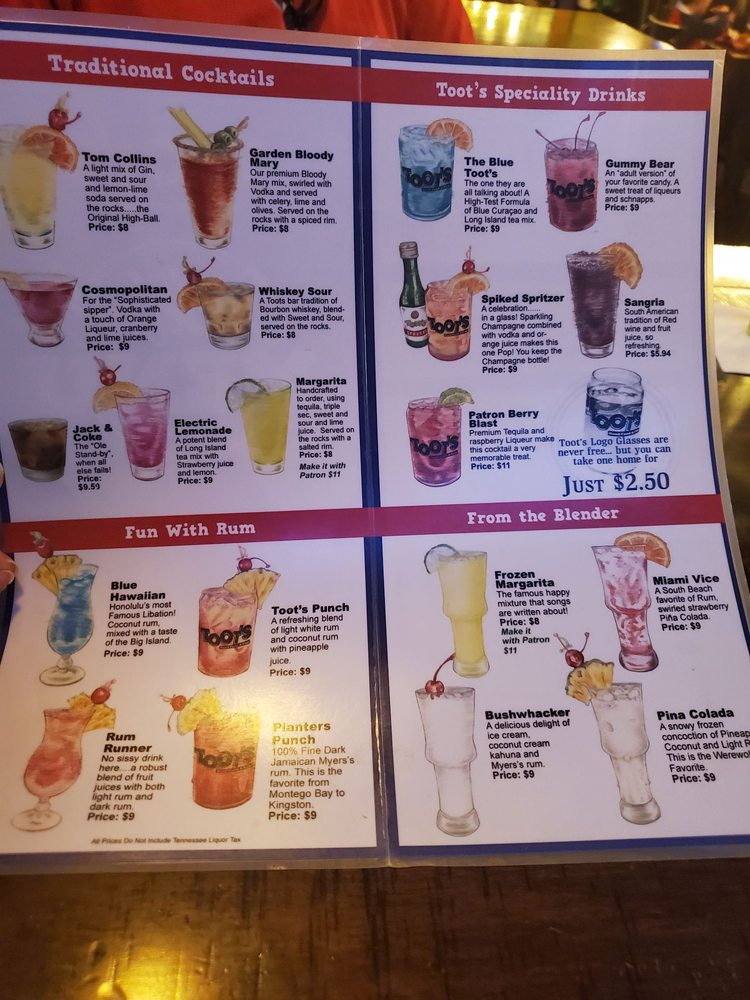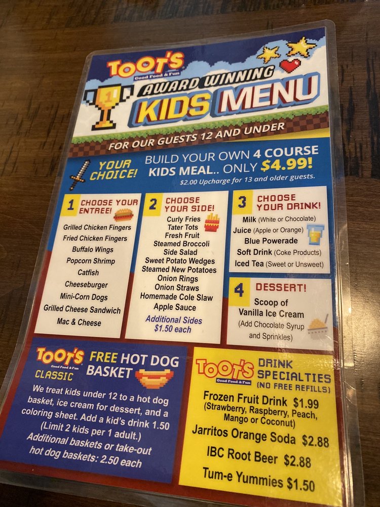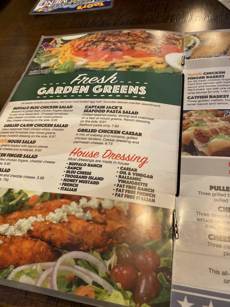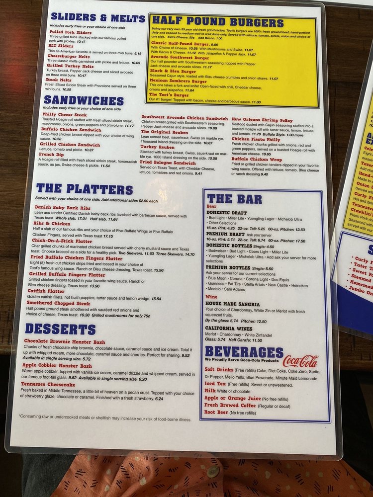 Toot's West, located in Murfreesboro, TN, is known for its delicious seafood dishes with an American twist. The menu includes options like Captain Jack's Seafood Pasta salad, Catfish and Shrimp Baskets, Fried Avocado Bites, and Homemade Chili. Customers rave about the mouth-watering food and excellent service, making it a favorite dining spot for families. The restaurant's casual yet trendy atmosphere, complete with a full bar and TV screens, adds to the overall dining experience. With a focus on consistency and quality, Toot's West stands out for its Western-themed decor and spacious dining area. Whether you're looking for a hearty meal or a place to relax with friends, Toot's West has something for everyone.